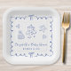 Niedliche Teller für Ihre Babydusche mit einem französischen, blauen Rahmen, der mit Bögen geschmückt ist, skurrile, von Hand gezeichnet Herzenbilder, Sterne, Kuchen- und Kinderzimmer-Dekor und der Name der künftigen Mutter in einem lustigen blauen Drehbuch.