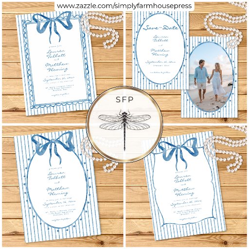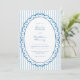 This whimsical invitation features a soft blue watercolor scalloped oval frame against a classic striped background. Perfect for a wedding with a preppy or coastal aesthetic, this charming design provides a sweet, hand-painted look for your special celebration. Created by Simply Farmhouse Press.