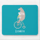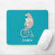 Ein Mousepad mit einer Touch Whimsy. Personalisieren mit einem Namen. Das Design ist eine skurrile Illustration mit einem lang gezogenen weißen Hasen, gelbe Hosen tragen, sitzend auf den Lenkern eines altmodischen Vintagen Fahrrads (großes Vorderrad und kleines Hinterrad). Das Fahrrad wird von einem großen braunen Bären mit weißen Flecken auf seinem Rücken gejagt. Schön und niedlich.