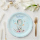 Adorable Teller für eine Babydusche, Geburtstag oder andere Veranstaltung mit einem skurrilen Vintagen Flair. Entworfen mit einer charmanten Illustration eines kleinen sonnigen Reitens entlang in einem Heißluftballon mit extravagantem rosa Band, zusammen mit einigen Blume und Schmetterlingen. Ein pastellblauer Aquarell verleiht ihm ein traumhaftes Gefühl.