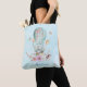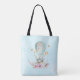 Eine personalisierte Tasche mit einer charmanten Illustration eines kleinen sonnigen Reitens in einem Heißluftballon mit einem extravaganten rosa Band, zusammen mit einigen Blume und Schmetterlingen. Der pastellblaue Aquarellhintergrund verleiht ihm ein Vintages, traumhaftes Ambiente.