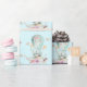 Auf einem Papier mit einer charmanten Illustration eines kleinen sonnigen Reitens entlang in einem Heißluftballon mit extravagantem rosa Band, zusammen mit einigen Blume und Schmetterlingen. Der pastellblaue Aquarellhintergrund verleiht ihm ein Vintages, traumhaftes Ambiente.