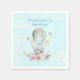 Eine Babydusche (oder eine andere Veranstaltung) Papierserviette mit einer hübschen Abbildung eines kleinen Hasen-Reitens in einem Heißluftballon, der mit einem extravaganten rosa Band geschmückt ist, sowie einige Blume und Schmetterlinge. Der pastellblaue Hintergrund verleiht ihm ein Vintages Traumgefühl.