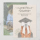 This Whimsical Calligraphy Graduation Bow Photo Announcement features a beautiful, hand-painted watercolor sketch of a graduate from a back-view perspective. The design highlights a stylish black mortarboard adorned with a delicate border of white pearls and a stunning, oversized fabric bow with long, flowing tails. To complete the look, the graduate holds a lush bouquet of creamy white roses.