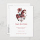 Save the date postcard with a cute retro style carousel horse. Drawn in Pretty pink colors with fancy flowers.