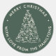 Add a timeless touch to your holiday mail with these modern Christmas stickers featuring a hand-drawn cream Christmas tree adorned with playful bows on a rich pine green background. The circular design displays your custom greeting and family name encircling the tree, creating a warm and elegant look perfect for the season. Ideal for sealing holiday card envelopes, gifts, and party favors, these stickers bring a refined, personalized accent to your Christmas cards and festive celebrations.