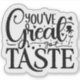 Feiern Sie mit diesem hübschen Aufkleber "You ve Great Taste" den tadellosen Stil Ihrer Kunden! Mit seiner eleganten Schrift, seinen kühlen Schriftart und den süßen Dekorationsakzenten ist es der perfekte Weg, Ihre Verpackung mit Persönlichkeit und Wertschätzung zu versehen. Ideal für Boutiquen, handgefertigte Waren und Marken, die Liebe bieten, ihre Käufer zu sehen und zu feiern.