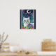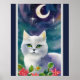 Die künstlerischen Plakate zeigen eine von der künstlerischen Intelligenz generierte digitale Aquarellmalerei einer hübschen weißen und grauen Katze mit kosmischem Himmelshintergrund
