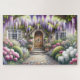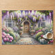 This enchanting scene captures the essence of a storybook cottage garden, bursting with lush blooms and cascading wisteria in soft purples, pinks, and whites. A charming arched wooden door welcomes you through a stone path framed by flowering shrubs, manicured greenery, and dreamy light filtering through the foliage. The overall mood is peaceful, romantic, and full of secret garden nostalgia—perfectly aligned with cottagecore and fairytale aesthetics. The composition draws you inward, evoking a sense of wonder and serenity beneath the floral canopy. AI generated artwork.