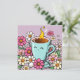 Blaue Tasse warmen Kaffees sitzend in einer Charge von niedlichen Cartoon rosa und gelb Blumen Aufkleber.