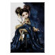 This whimsical dark circus doll illustration captures the mysterious charm of a vintage carnival. With her large expressive eyes, flowing red curls, and striped Victorian-style dress, the doll sits quietly atop a travel trunk surrounded by circus tents, bunting flags, and nostalgic stage props.