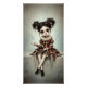 This whimsical dark circus doll illustration captures the mysterious charm of a vintage carnival. With her large expressive eyes, flowing red curls, and striped Victorian-style dress, the doll sits quietly atop a travel trunk surrounded by circus tents, bunting flags, and nostalgic stage props.