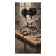 This whimsical dark circus doll illustration captures the mysterious charm of a vintage carnival. With her large expressive eyes, flowing red curls, and striped Victorian-style dress, the doll sits quietly atop a travel trunk surrounded by circus tents, bunting flags, and nostalgic stage props.