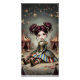 This whimsical dark circus doll illustration captures the mysterious charm of a vintage carnival. With her large expressive eyes, flowing red curls, and striped Victorian-style dress, the doll sits quietly atop a travel trunk surrounded by circus tents, bunting flags, and nostalgic stage props.