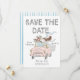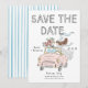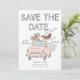 Whimsical Doodle Quirky Save the Date - A fun, trendy hand drawn Save the Date featuring the happy couple riding in a pink convertible with a bouquet of flowers and quirky hand written typography. The back of the invitation is a blue striped background. So fun!
