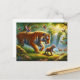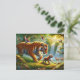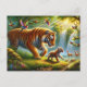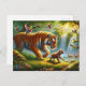 Eine lebendige und bezaubernde Dschungelszene, in der ein Muttertiger und ihr spielerischer Junge eine üppige, sonnige Lichtung durchqueren. Farbenfrohe Vögel, wie Papageien und verschiedene Singvögel, flattern herum und fügen Farbtupfer vor dem grünen Hintergrund hinzu. Ein ruhiger Wasserfall kaskadiert sanft im Hintergrund und erzeugt einen Nebel, der das goldene Licht einfangen lässt, das durch den dichten Baumkronen oben filtert. In der Nähe steht eine Hirschgruppe in Alarmbereitschaft und beobachtet die Tigerreise durch den Wald. Wildblumen und Farne bedecken den Boden, und Sonnenlicht strömt durch die Bäume, beleuchtet die Szene mit einem warmen und magischen Glühen.