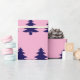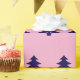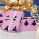 Ein Muster dunkelblauer Weihnachtsbäume erscheint auf diesem hellrosa Umhüllungspapier.