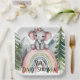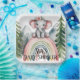 Feiern Sie die Freude einer neuen Ankunft mit dieser bezaubernden Aquarellszene, die perfekt für ein Babyduschthema geeignet ist. Ein süßer Elefant mit einer rosa Blumenkrone sitzt auf einem pulsierenden Regenbogen, umgeben von üppig grünen Pinien und majestätischen Bergen in der Ferne. Das weiche und verträumte Aquarelldesign verleiht eine magische Touch, die sich ideal für ein klangvolles und herzliches Fest eignet.