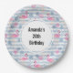 Geburtstagspapier-Teller mit einem Muster mit einem lustigen sommerlichen Ambiente. Rosa Flamingos und Ananas Set auf einem hellblau gestreiften Muster mit Blätter und Herzen herum.