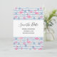 Save the Date ein Muster mit einem lustigen sommerlichen Ambiente. Rosa Flamingos und Ananas Set auf einem hellblau gestreiften Muster mit Blätter und Herzen herum.