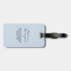 Ein Gepäckanhänger mit einem Muster mit einem lustigen sommerlichen Flair. Rosa Flamingos und Ananas Set auf einem hellblau gestreiften Muster mit Blätter und Herzen herum.