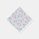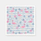 Papierservietten mit einem Muster und einer lustigen Sommeratmosphäre. Rosa Flamingos und Ananas Set auf einem hellblau gestreiften Muster mit Blätter und Herzen herum.