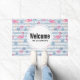 Herzlich willkommen an der Tür mit einem Muster mit einer lustigen sommerlichen Atmosphäre. Rosa Flamingos und Ananas Set auf einem hellblau gestreiften Muster mit Blätter und Herzen herum.