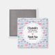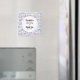 Ein Geburtstags-Gunst-Magnet mit einem Muster mit einer lustigen sommerlichen Atmosphäre. Rosa Flamingos und Ananas Set auf einem hellblau gestreiften Muster mit Blätter und Herzen herum.