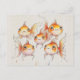 Ein zartes Aquarellbild mit fünf zauberhaften Goldfischen mit runden, ausdrucksvollen Augen und sanften Orangentönen. Ihre fließenden Flossen erzeugen ein Gefühl der Bewegung, während subtile Tropfen von Aquarellfarben einen traumhaften surrealen Effekt erzeugen. Der Hintergrund bleibt hell und luftig, was den skurrilen und ätherischen Charme des Gemäldes unterstreicht. Dieses Kunstwerk vereint wunderbar Fantasie und Natur und macht sie zu einem faszinierenden und herzlichen Werk