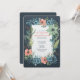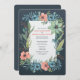 Eine schöne Hochzeitseinladung, die das Design eines Blumenrahmens mit Blätter vor einem dunklen Hintergrund, im Stil von dunklem Aquamarine, strukturierte Illustrationen, Aquarell und lebendige Farben von coolem Blau, Lachs und Grüntönen hat. Es ist so skurril, delikat und niedlich. Ideal für eine Frühjahrshochzeit.