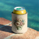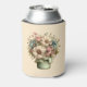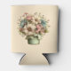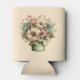 A can cooler with a cute image. Blue. pink and cream colored flowers with green leaves. Set inside a green flower pot with a green plaid cloth hanging over the side.