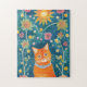 Das Whimsical Puzzle für Katzenliebhaber bietet eine orangefarbene Tischkatze, umgeben von Blume der Volkskunst. Digitale Aquarellbilder, die mit AI-Software erstellt wurden.