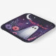 Ein festliches Halloween-Design mit einem freundlichen Geist, der in einem Feld lila und rosa Blume stehend ist. Der Hintergrund ist ein sterniger Nachthimmel mit einem Halbmond, der dem Design eine Touch Magie verleiht. Die Worte "Happy Halloween" werden in rosa Schrift prominent angezeigt, während am Ende eine personalisierte Nachricht erscheint. Dieses Dekorationsobjekt ist eine perfekte Ergänzung zu jedem Halloween-Party oder jeder Ansammlung und fügt den Festlichkeiten eine skurrile und fröhliche Touch hinzu.