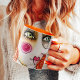 Diese Tasse der whimsical art wurde mit einer lustigen Mischung aus meiner originalen, eigenartigen Girl-Illustration "Frenchie" entworfen. Sie hat rotes Haar mit zufälligen Spiralfliege-Aways, einem grünen Auge und einem blauen Auge, leuchtend rosa Lippen und Wangen und einer verrückten langen Nase.