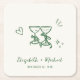 Romantic light cream coasters for your engagement party, rehearsal dinner, wedding reception, party favors, etc., that feature whimsical green hand-drawn illustrations of a heart, stars and toasting wine glasses, and the names of the bride and groom in a playful green script.