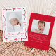 Mit dieser süßen und festlichen Geburtsankündigung kündigen Sie die Ankunft Ihres Babys an. Ein handgezeichnet rotes Band und ein Bogen umrahmen das vertikale Foto Ihres Babys auf der Vorderseite, wobei ihr Name und die Geburtsdetails in einem schönen handgeschriebenen Skript dargestellt werden. Auf der Rückseite befindet sich ein horizontales Foto mit Platz für Ihre persönliche Nachricht. Dieses kühne rote Design ist ideal für die Heiligabsage oder die Geburtstagskündigung am Valentinstag, aber zeitlos genug, um Ihr Baby zu jeder Jahreszeit zu feiern.