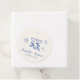 Romantische helle Creme-Hochzeitsgeschenk-Anhänger mit whimsical handgezeichneten blauen Illustrationen eines Herzens, Sternen und Toast-Weingläsern und "mit Liebe + Dank" und den Namen der Braut und des Bräutigams in einer spielerischen blauen Schrift.