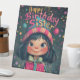 Dies ist ein wunderschön illustriertes Geburtstagsdesign mit einem niedlichen, mit Augen Mädchen mit dunklem Haar, rosigen Wangen und einem hellen Lächeln. Sie trägt einen farbenfrohen gestreiften Hut mit einem Pompom, der dem lebhaften und festlichen Hintergrund mit schwebenden Blasen, Sternen und magischen Glitzern entspricht. Die herzliche, von Hand gezeichnet Typografie der "glücklichen GeburtstagsSchwester" fügt eine spielerische Touch hinzu, die das Thema Freude und Feiern ergänzt. Das umhüllte Geschenk mit einem dekorativen Bogen verstärkt das Geburtstagsthema und macht dies zu einem idealen Gruß.