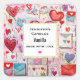 Kerzen, Seifen, Handschuhe oder Küchenaufkleber mit einem skurrilen Muster. Scrapbook Stil Doodles und Skripte. Rote und rosa Herzen und verschiedene Briefe und Umschläge verstreut herum.