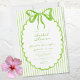 This whimsical bridal shower invitation features a bright lime green watercolor bow and a playful scalloped oval frame against a classic lime green and white striped background. Perfect for a shower with a preppy or coastal aesthetic, this charming design provides a sweet, hand-painted look for your special celebration. Created by Simply Farmhouse Press.
