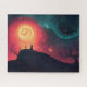 Eine traumhafte Fantasy-Szene mit einem Kind auf einem Hügel unter einer strahlenden surrealen Sonne und wirbelnden kosmischen Himmel, symbolisiert Wunder und Fantasie. Das ist ein tolles Design für kunstvolle und farbenfrohe Rätselfreunde.