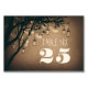 Diese Tischnummer-Karte (oder Platzkarte) verfügt über Glühkerzengläser und Hängeleuchten an den braunen Baumzweigen. Perfekte Tischnummer für rustikale Hochzeitsthemen.