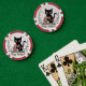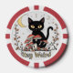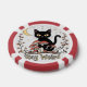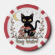 Whimsical noir cat framed by red mushrooms and pal pokerchips