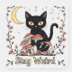 Whimsical noir cat framed by red mushrooms and pale flowers under a crescent moon; bold, hand‑drawn style ideal for quirky animal lovers and night‑owl fashion fans.