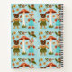 Whimsical notebook design with cartoon bears in green outfits and blue overalls, amid red mushrooms on a light blue background; playful and cheerful theme.