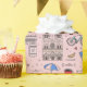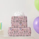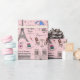 Whimsical Geschenkpackung hat ein handgezeichnetes Muster, das Doodles aller Dinge in Paris zeigt, vom Eiffelturm und Arc de Triomphe bis zu Bistrostühlen und Makaronen auf pastellrosa Hintergrund.