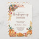 Delightful Thanksgiving invitation featuring a charming patchwork turkey with decorative patterns and autumn leaf accents. String lights add a festive touch while watercolor pumpkins and harvest foods create a cozy, inviting scene. Perfect for family-friendly Thanksgiving dinners with a playful, warm atmosphere. The whimsical turkey design brings joy and personality to your celebration.