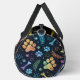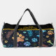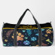 This unique duffle bag features a whimsical colorful pattern on a black background, showcasing various colored paw prints, bones, and leafy details. It's a practical pet accessory and versatile organizer for travel and everyday use.
