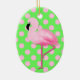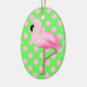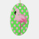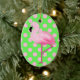Farbenfrohe Weihnachtsbaum / Dekoratorschmuck, mit Grafiken eines flauschig aussehenden rosa Flamingo, vor einem knallgrünen Grün mit rosa Polka Punkt Hintergrund. Fügen Sie den gewollt Text hinzu, indem Sie ihn anpassen. Spaß Geschenkidee für jeden Flamingo Liebhaber.