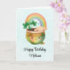Geburtstagskarte mit einer anmutigen Abbildung mit einem lächelnden grünen und goldenen Topf mit einem niedlichen Regenbogen, einer glücklichen Wolke und einem grünen Klee.